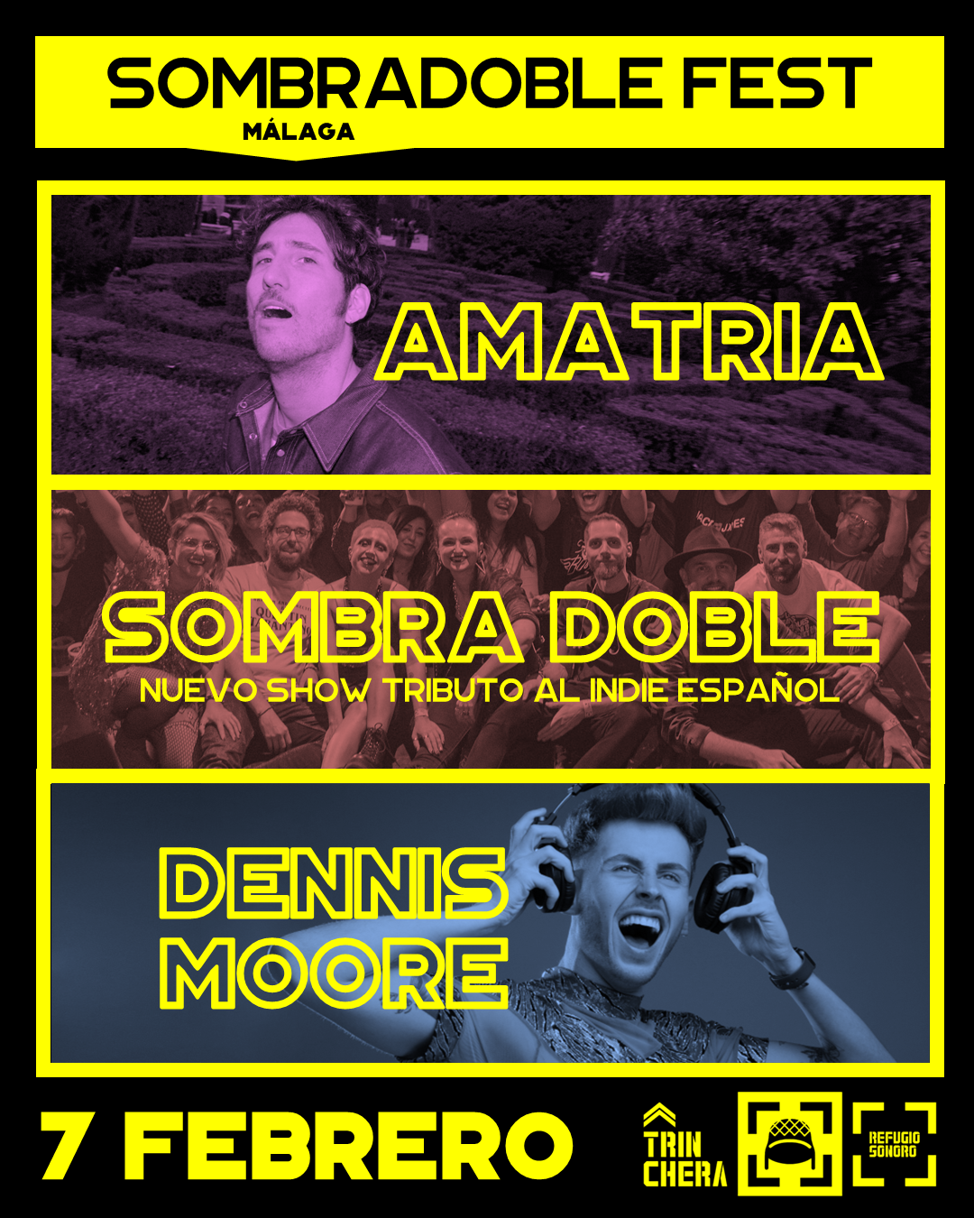 Sombra Doble, la banda de Tributo al Indie Español más veterana del país, con 12 años de trayectoria, regresa a los escenarios con un súper festival en el que también participarán Amatria, referencia absoluta del pop electrónico nacional, y el carismático DJ Dennis Moore, con sus desenfadadas mezclas de pop y urban hits.